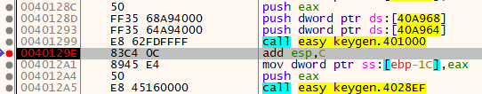 00401299 주소에서는 call easy keygen.401000 명령을 통해 401000 주소에 위치한 함수를 호출한다.