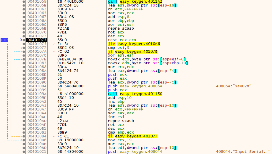 먼저, 가장 눈에 뛰는 코드는 0040106E 주소의 repne scasb 명령이다.